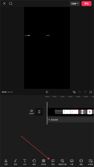3、进入视频剪辑的页面内,点击下方特效的按钮。