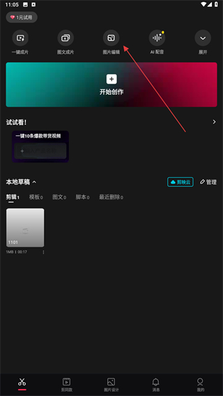 1、启动剪映的APP,进入首页点击上方图片编辑的按钮。
