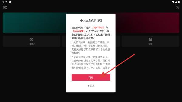 1、打开剪映APP,进入时会弹出个人信息保护指引,点击同意的按钮。