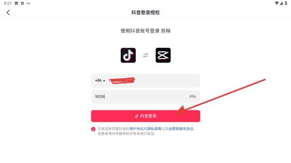 4、在抖音登录授权的界面下,输入要登录的手机号、验证码,再点击抖音登录即可完成。