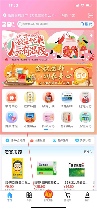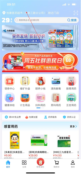 1、在怡康到家APP首页,点击顶部附近门店选项。