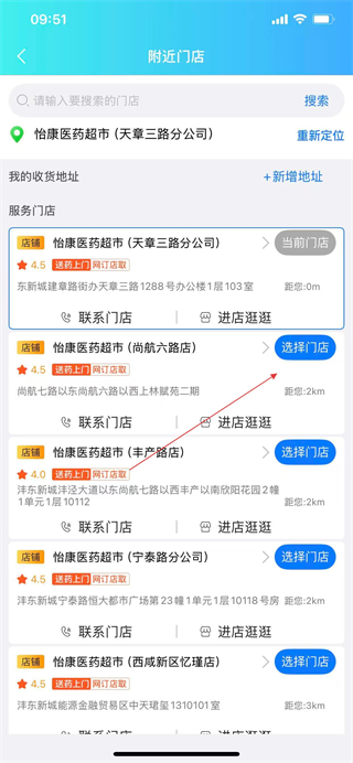 2、进入附近门店页面后,选择想要切换的门店,点击选择门店。