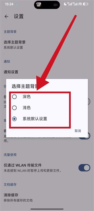 3、在设置页面里,点击选择主题背景,弹出主题背景的选择弹窗。