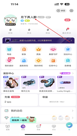 2、在我的页面内,点击用户昵称的区域位置。