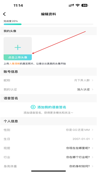4、在编辑资料的页面内,点击上传头像的按钮即可。