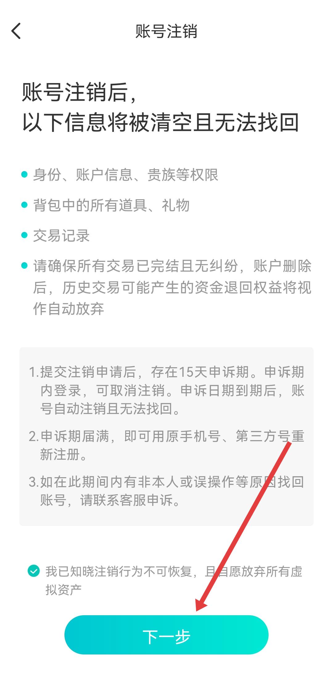 4、在账号注销页面,勾选我已知晓等注意事项,然后点击下一步,按指引完成后续注销操作。