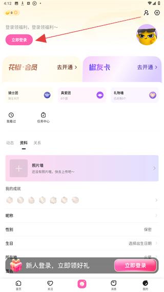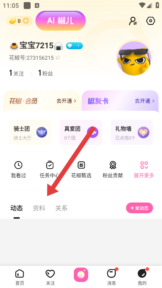1、打开花椒直播APP,进入我的页面,点击资料标签,切换到资料设置界面。