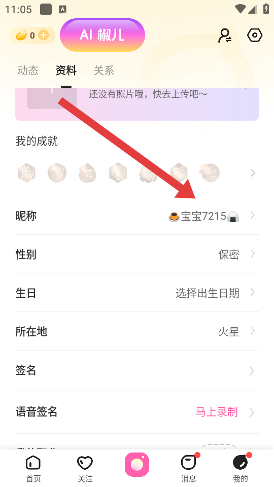 2、在资料的页面中,找到昵称的选项并点击,进入修改昵称的页面。