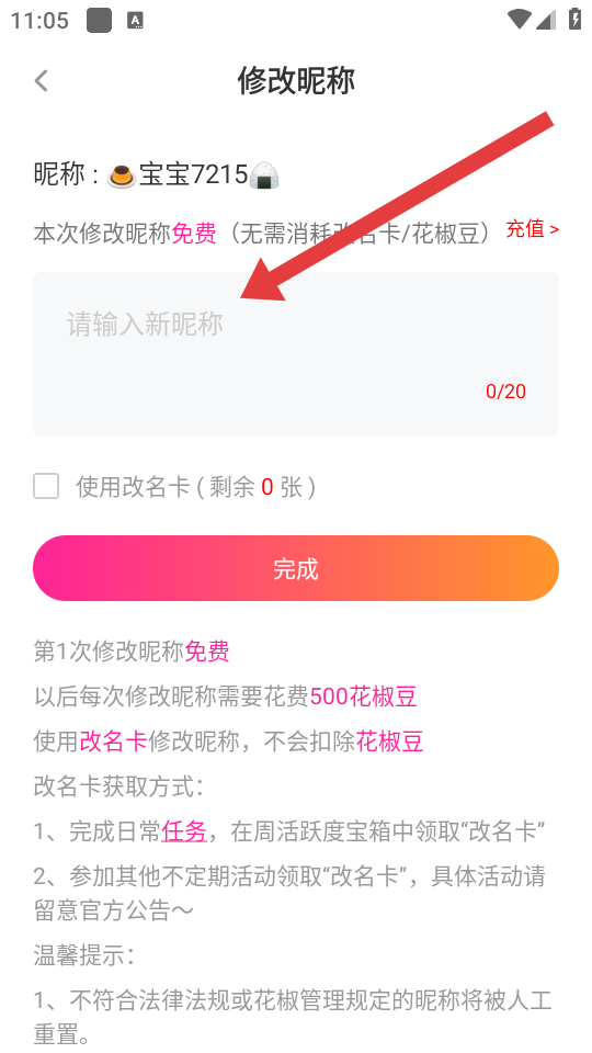 3、需要在修改昵称页面的输入框中,输入新的昵称如示例中的1111111。