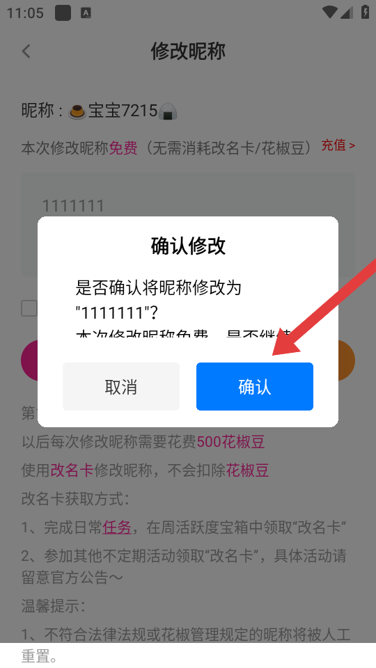 4、当弹出确认修改的对话框时,点击确认的按钮,即可完成昵称修改。