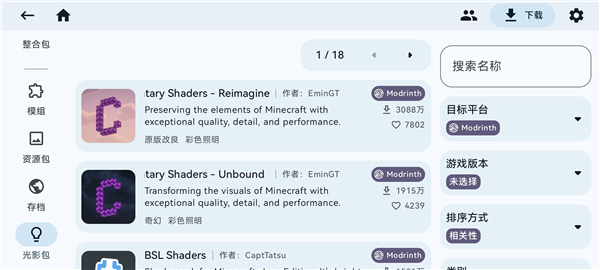 不同类型的模组在软件里都有着相应的展示,你可以快速查看模组的具体介绍,了解这些优秀模组的玩法,支持资源包安装功能,完成安装之后,游戏的画质会再次提升一个量级。