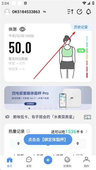 1、打开OKOK体脂秤,在首页点击右上角的历史记录。