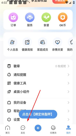 1、打开OKOK体脂秤首页,点击底部我的选项,进入个人页面。