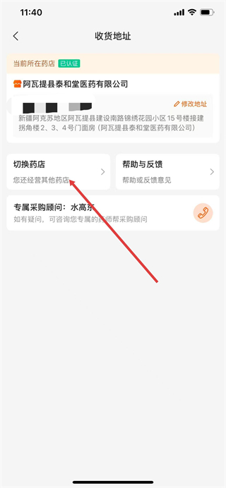 3、在收货地址页面,点击切换药店选项。