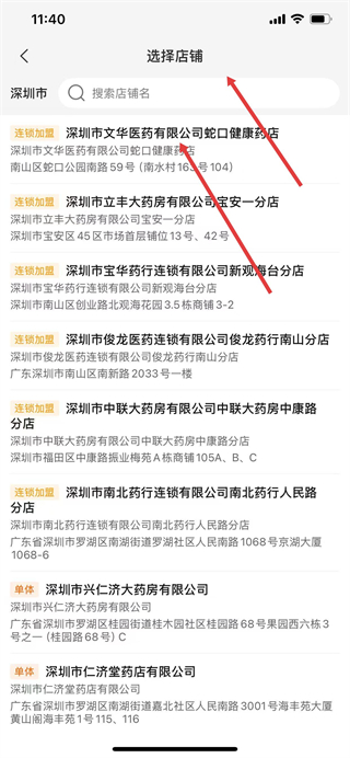 5、在选择店铺页面,挑选目标药店。