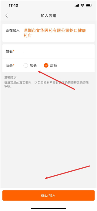 6、在加入店铺页面,填写姓名并选择身份,点击确认加入完成药店信息添加。
