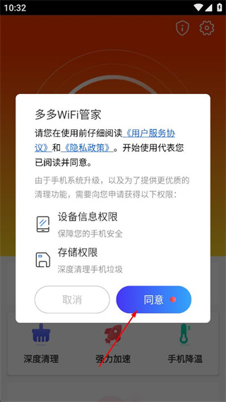 1、打开多多WiFi管家后,阅读弹出的用户服务协议和隐私政策内容,点击界面中的同意按钮。