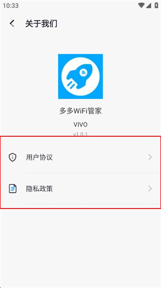 4、进入关于我们页面后,即可看到用户协议和隐私政策相关选项,可按需进行查看。