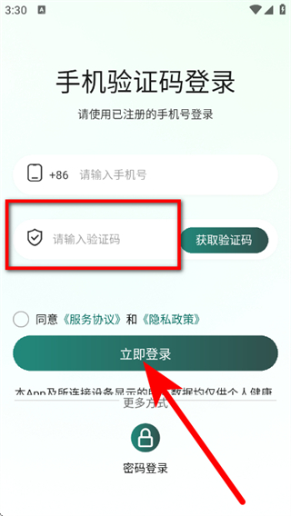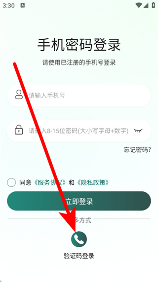 2、在密码登录页面,点击验证码登录,进入手机验证码登录页面。