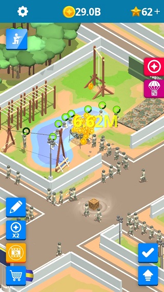 创造世界上最伟大的军事基地,你将以二等兵身份从军队训练营起步,经受各种考验,完成一系列训练挑战,从而顺利毕业,为世界各地的军事行动做好准备!随着基地中的军事训练逐步进展,你将获得金钱并扩张营地,可以升级所有训练区的数值、速度、容量和队列规模。