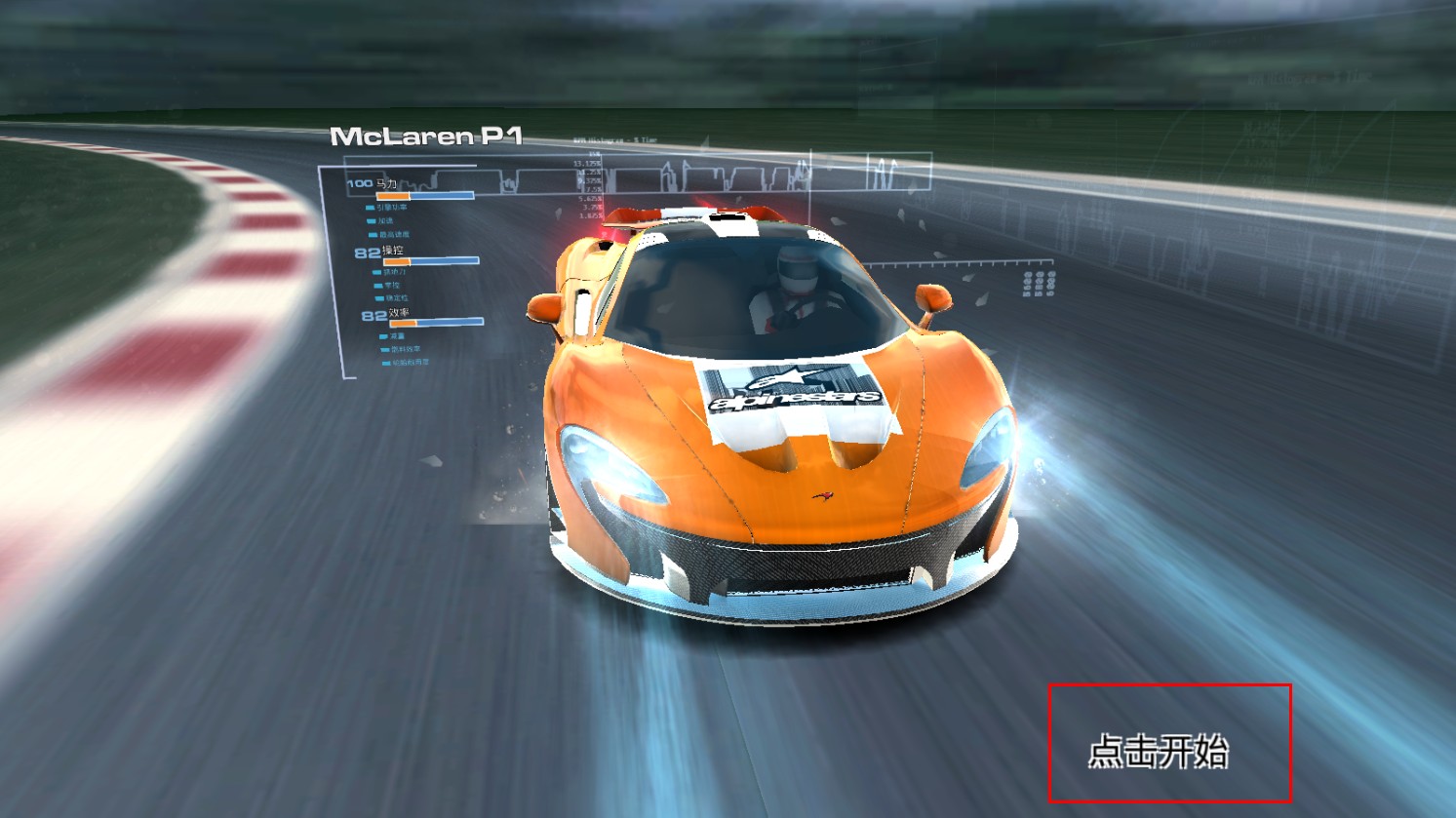 1、点击【点击开始】,操控McLarenP1赛车,开启赛道竞速。