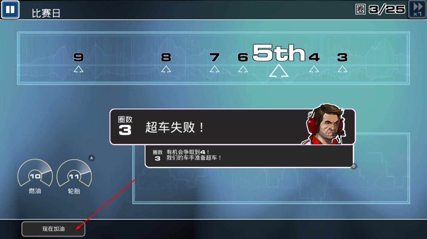 2、比赛若超车失败,点击【现在加油】,补充资源,提升赛车状态。