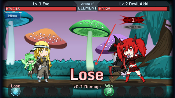 2、界面显示【Lose】,触发0.1倍伤害效果,对手处标注【WEAK】标识。