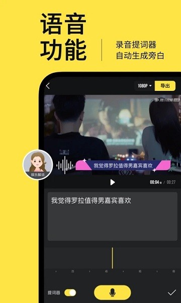 录音时支持打开提词器,边提词边进行录音。同时录音支持断点续录,录错的部分可马上覆盖重录。支持3000字以内文字转化成语音旁白,并提供十余款音色供选择。