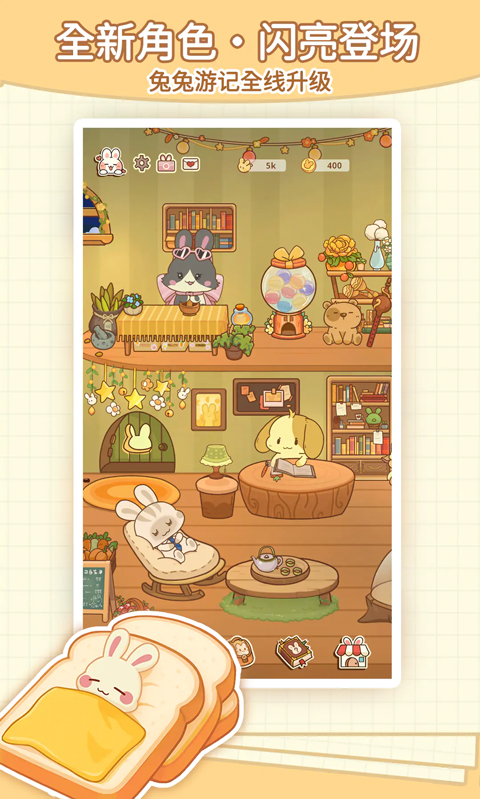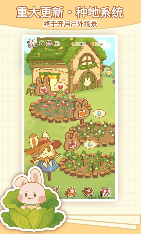 - 兔兔们在温馨的小屋中生活和休息,可以观察它们的日常,并安排它们去打工赚取金币。