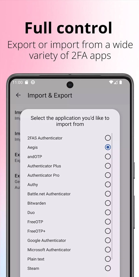为了让切换过程更轻松,Aegis Authenticator支持导入多款其他身份验证器的条目,具体包括:Authenticator Plus、Authy与OTP、FreeOTP、FreeOTP +、Google Authenticator、Microsoft Authenticator、Steam、TOTP Authenticator,以及无导出选项的WinAuth应用。