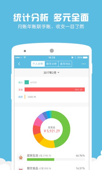 4. 通过图表分析功能查看开销分布情况,及时调整预算和消费计划。