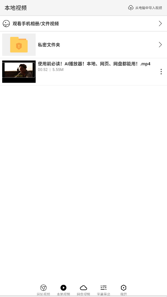 3、在首页还可以选择直接观看手机相册内的视频,右上角可以点击从电脑中导入视频。