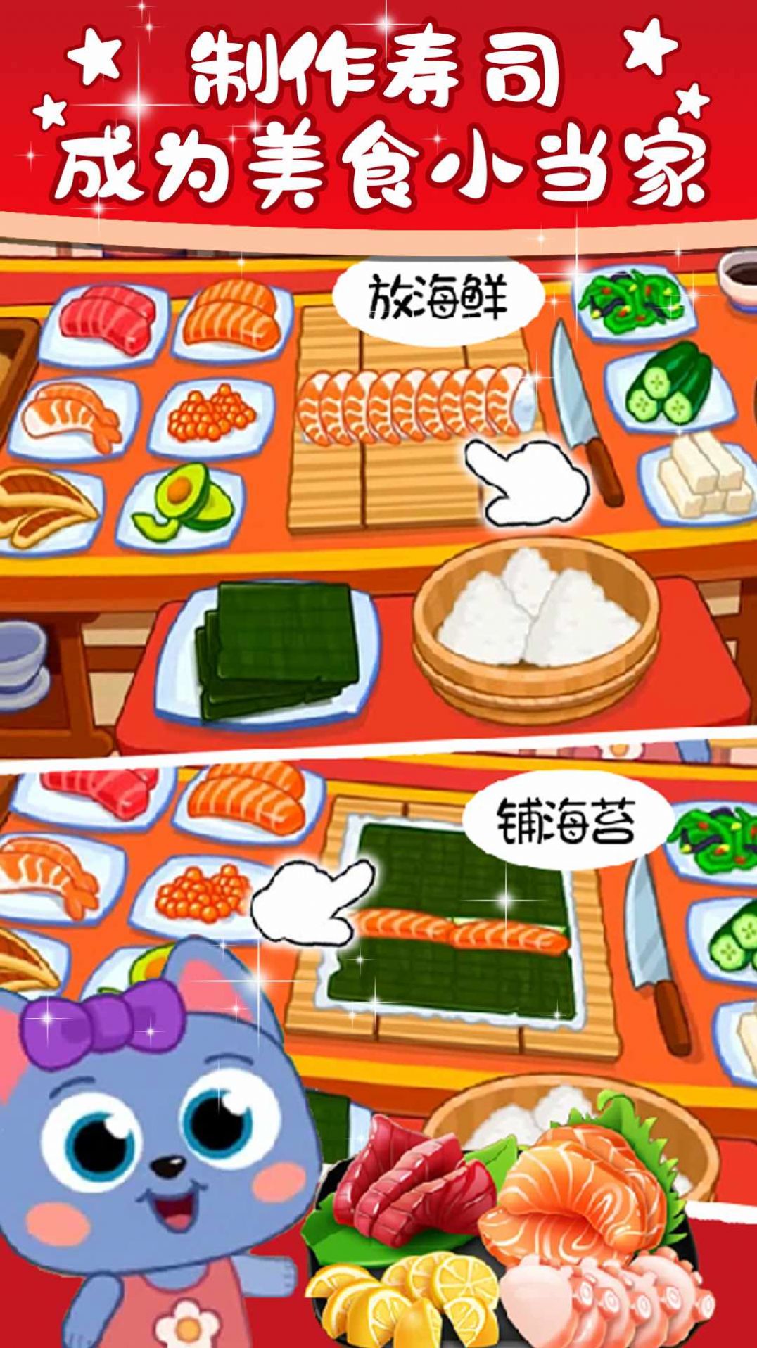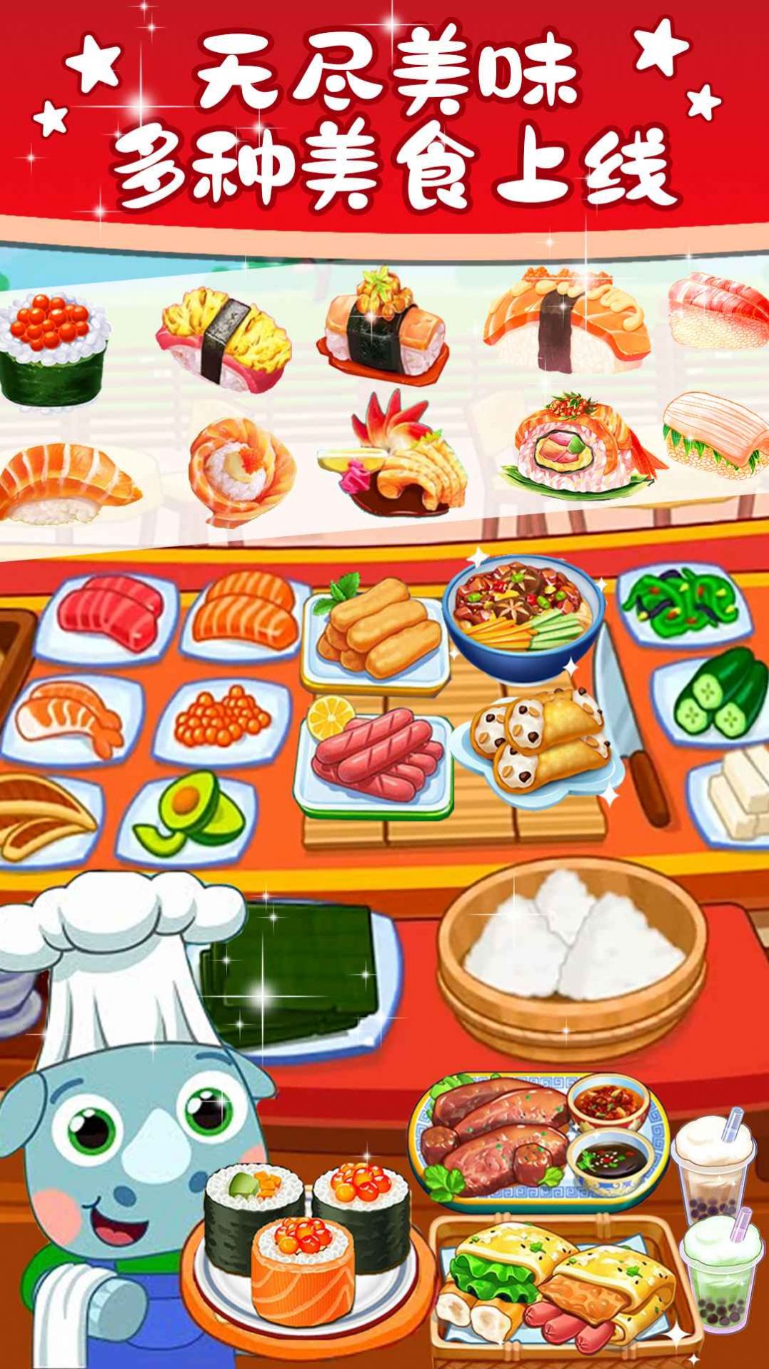 3. 寿司制作:玩家可以根据不同的配方制作出各种美味的寿司,满足顾客的需求。