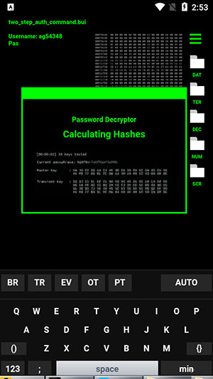 7、选择右下角【min】选项,就可以把键盘隐藏,点击【+号】图标就可以恢复键盘,这样是不是显得更像一名专业的黑客了,以上就是geektyper手机版的用法了。