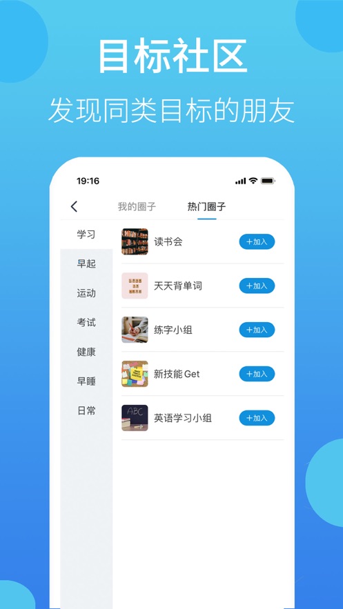 设定日常小目标,每天坚持为自己的计划目标打卡,告别拖延症,让朋友们共同见证您的成长与蜕变;