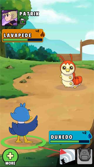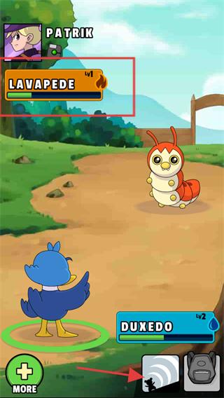 1、对战界面确认对手【PATRIK】的【LAVAPEDE-lv1】,操控己方【DUXEDO-lv2】点击技能按钮发起攻击。