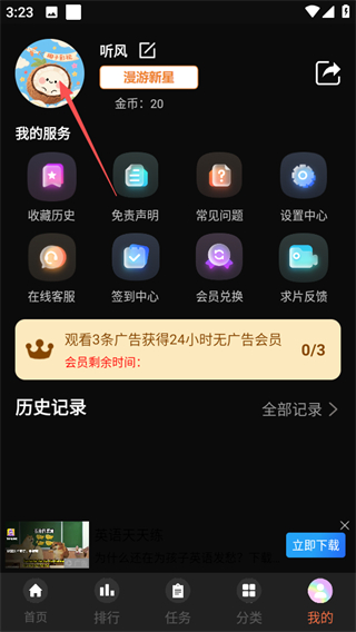 1、在椰子影视首页点击我的选项,进入个人中心页面。