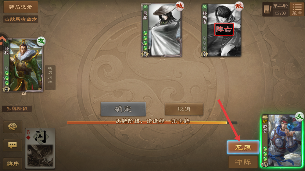 1、点击【龙胆】,赵云可将手牌中【闪】当做【杀】使用,以此攻击敌方吕蒙。