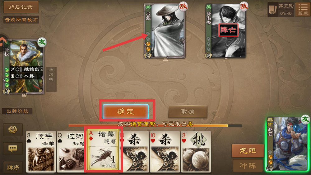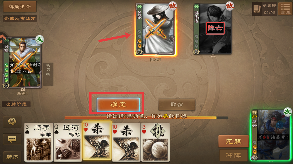 4、之后选【杀】点【确定】,持续攻击吕蒙,配合技能与装备快速制胜。