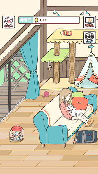 点击画面上的家具在让猫咪互动之外,也可以获得金币,同时选择点击屏幕中的人,将会开启和人们之间的互动。达到一定的条件后将解锁一格小故事 游戏中可以通过扭蛋获得玩家,将所获得的玩具放置在院中,将吸引更多的猫咪来访 购买鸟粮,放到鸟粮台,吸引小鸟与猫咪玩耍。