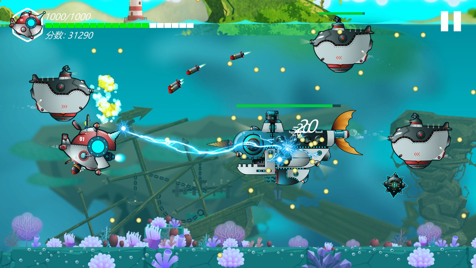 每通过一个关卡,你将获得一次补给机会,这些补给可以修复、强化你的潜艇以及让潜艇获得多种技能;