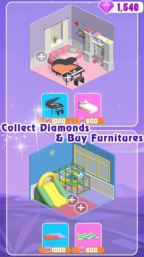 收集尽可能多的钻石并解锁花式房屋。你知道吗?你可以选择你最喜欢的主题和任何你喜欢的家具来装饰你的房子!