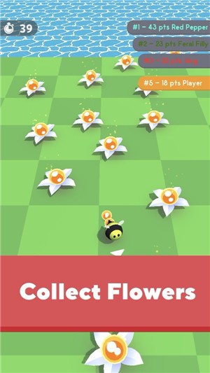 游戏的玩法类似贪吃蛇,玩家在收集花蜜的同时,身后的蜂蜜会越来越长,玩家要及时的将这些蜂蜜放到蜂巢中,防止其他的蜜蜂来攻击你,谁收集的花蜜越多,就可以获得游戏的胜利。