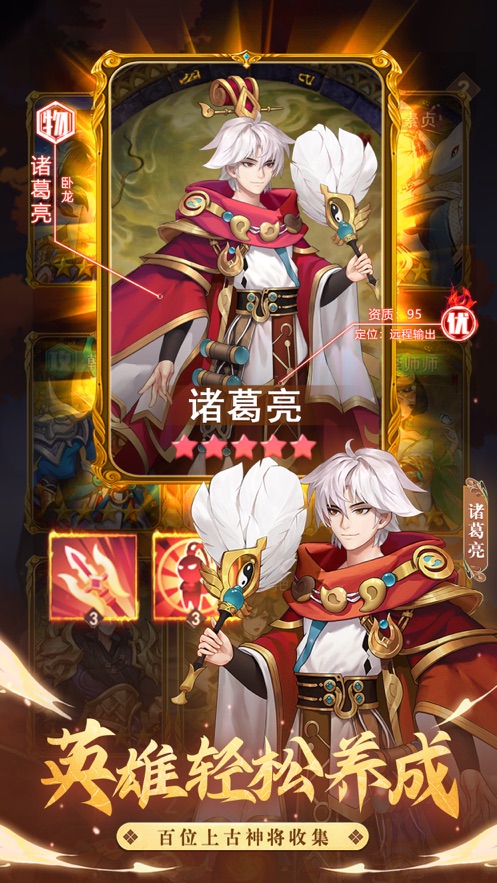 1、一款休闲放置挂机手游,融合了各类神话历史背景,游戏内高度还原古代文人战将;