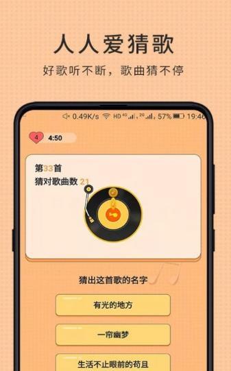 这是一款猜歌闯关玩法的趣味游戏,经典的猜歌游戏,每次只给你听一小段音乐然后让你猜对歌曲的名称,难度还是比较高的,但是如果你平时喜欢听歌而且听过的歌曲类型非常多记忆力也比较好,那么这些对你就都不是问题了!