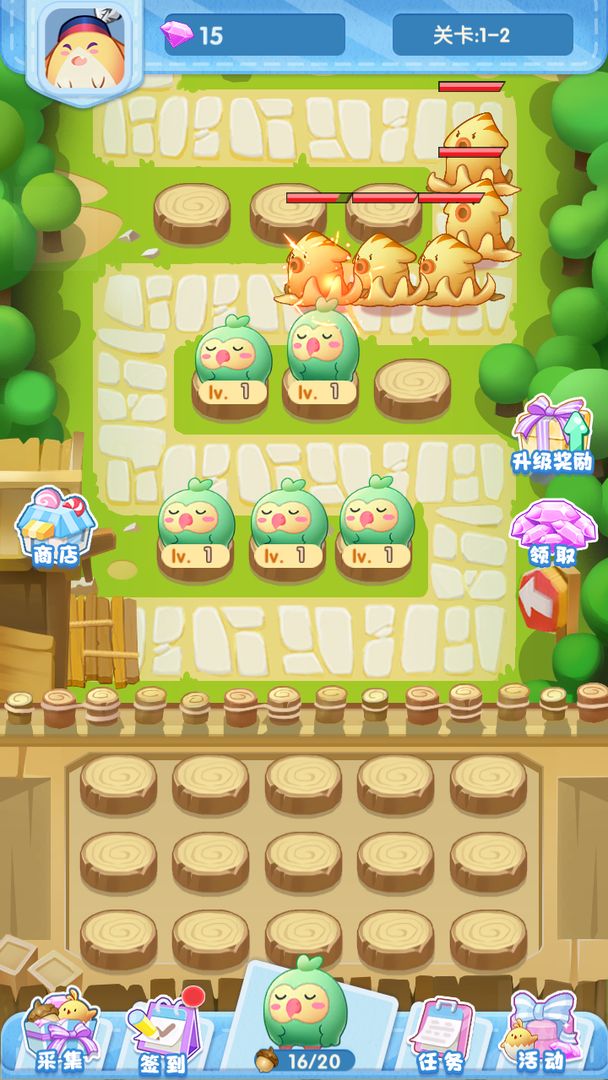 1、布局萌军战队防御,战胜对手搜集游戏道具。