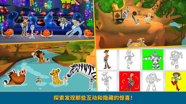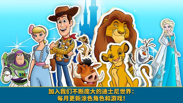 1、采用经典的迪士尼题材,非常具有创意的填色涂鸦游戏,玩法简单有趣,老少皆宜;