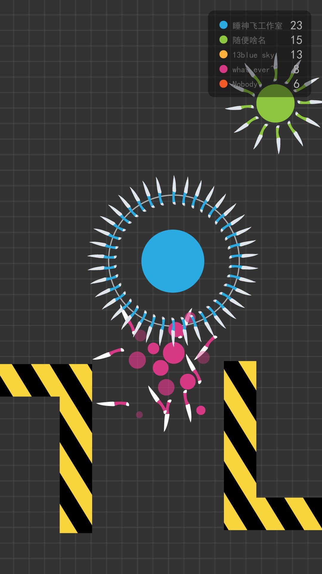 2、页面简洁操作简单,在吞噬和防御之间灵活切换,避开各种障碍物让你的飞刀圈圈称霸全竞技场。