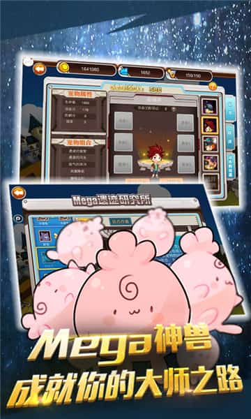 3.mega神兽,成就你的大师之路,让你的小精灵们快速的成长起来,不断的晋升,成为超强的神兽,制霸全场。