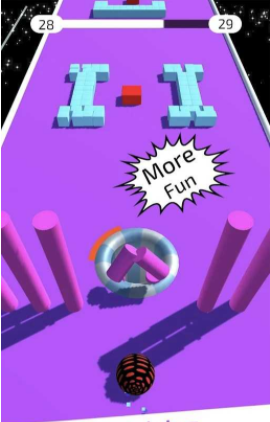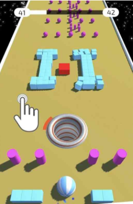 2、直线前进的开始的,通过滑动我们知道的里面的圆球的位置,进行各种的障碍的躲避的内容。